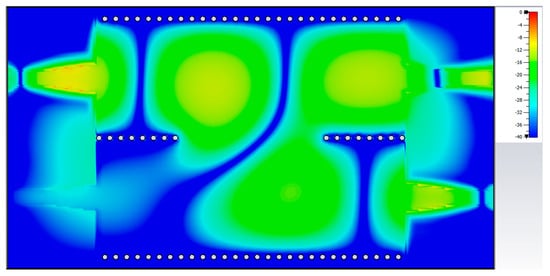 The simulated results of the proposed coupler are presented in Figure 9. The results indicate that in the frequency range of 8.5 GHz to 11.5 GHz, the insertion loss of the proposed coupler is approximately −2 dB, the is nearly −5 dB, while and are smaller than −15 dB. At the center frequency of 10 GHz, the measured values of are −32 dB, −2.0 dB, −4.7 dB, and −33 dB, respectively. Additionally, the electric field distribution of the proposed coupler can be seen in Figure 10.