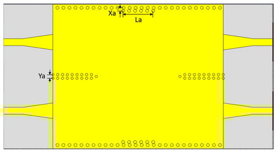 The electric field distribution of the basic coupler shown in Figure 6 indicates that power from the input port (port 1) leaks into the isolated port (port 4). To minimize this leakage, we propose adjusting the width of the SIW to modify the reflex waves. Two via lines are positioned near the outer edges of the SIW at the aperture location to implement the idea. This adjustment helps control the power transfer ratio among the ports. Figure 7 illustrates the structure of the proposed directional coupler. From the figure, we can see that the width of the SIW is determined by the length of the added line at the outer vias () and the distance from the added line to the outer line (). To enhance the control over the S-parameters of the coupler, we incorporated two additional via lines in the center of the SIW, which create the coupler’s aperture. By modifying the two parameters, Wa and Ya, we can effectively manage the S-parameters of the coupler.