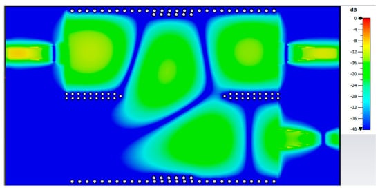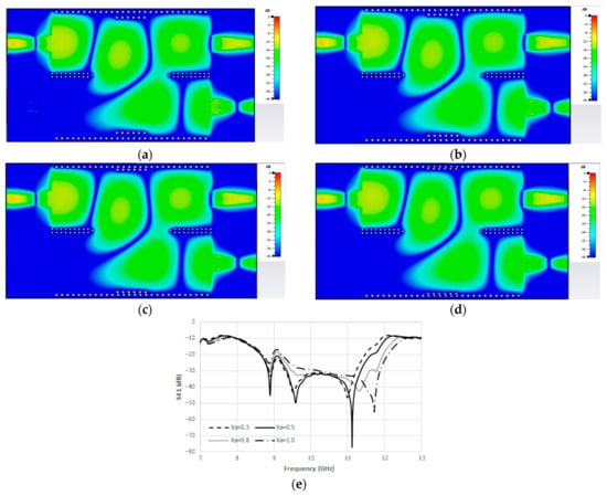 Figure 8 illustrates the process of adjusting to assess the impact of added vias on the performance of the coupler. This control procedure can be evaluated through the electric field distribution. Figure 8a–d show the electric field distribution of the coupler at 10 GHz for the cases where , , , and . The scattering parameter of the coupler at 10 GHz for these values is −29.2 dB, −31.8 dB, −33 dB, and −32 dB, respectively.