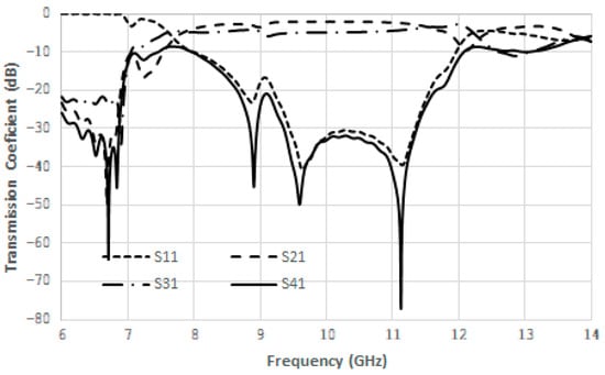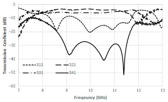 Figure 14 presents the measurement results of the proposed coupler. As shown in the figure, the proposed circuit exhibits good characteristics for a directional coupler. In the frequency band from 8.5 GHz to 11.5 GHz, is nearly −3 dB, while the coupling level is approximately −6 dB. Additionally, the isolation level is less than −10 dB, and is less than −20 dB. At a center frequency of 10 GHz, the measured values of are −20.2 dB, −3.3 dB, −6.0 dB, and −28.6 dB, respectively.