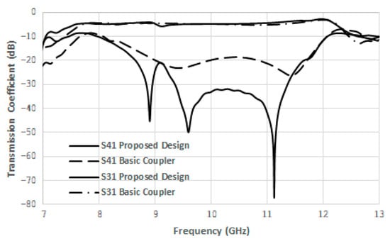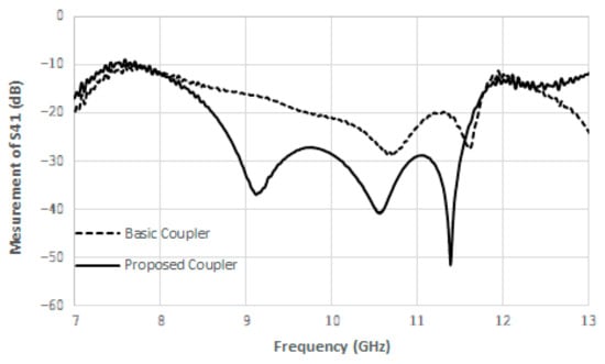 The figure demonstrates that the proposed coupler exhibits a high level of isolation. Figure 11 compares measured results of the basic coupler with that of the proposed coupler. In the X-band, the proposed coupler achieves better performance, with higher isolation than the basic coupler. Both couplers provide the same level of −5 dB ; however, the directivity of the proposed coupler is superior to that of the basic coupler.