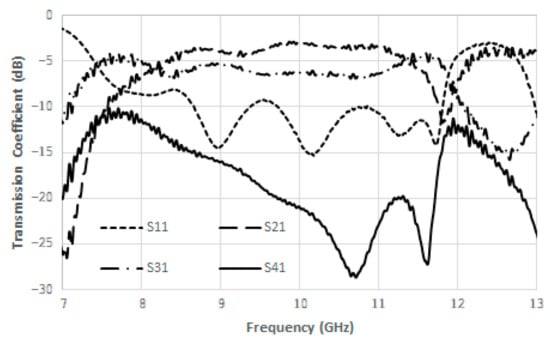 Figure 13 presents the measured results for the basic coupler. In the frequency band ranging from 8.5 GHz to 11.5 GHz, is nearly −3 dB, while is approximately −6 dB. Additionally, is less than −10 dB, and is below −15 dB. At the center frequency of 10 GHz, the measured values are −13.7 dB for the return loss, −3.0 dB for the insertion coefficient, −6.2 dB for the coupling loss, and −21 dB for isolation, respectively.