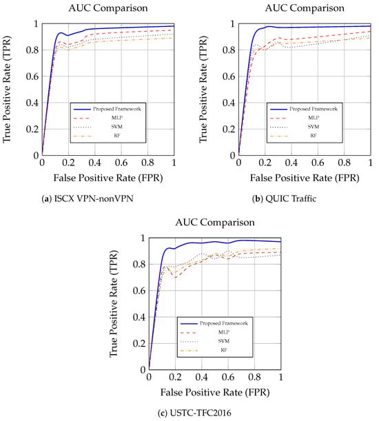 To visualize the performance, the ROC curves for all methods on the ISCX VPN-nonVPN, QUIC, and USTC-TFC2016 datasets are shown in Figure 1. These plots highlight the clear superiority of the proposed framework in differentiating traffic classes, as evidenced by its higher AUC values.