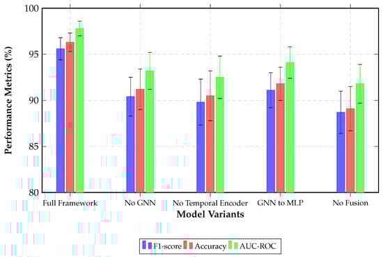 Figure 2 provides a visual comparison of the F1-scores achieved by different model variants on the ISCX VPN-nonVPN dataset. The bar chart highlights the critical impact of the GNN and temporal encoder on overall performance, with the full framework showing a clear advantage.
