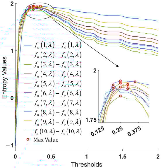 As shown in Figure 2, under this model,  is taken as the optimal threshold. However, as the threshold increases, the noise sequence enters both noise and effective information, and the denoised sequence simultaneously eliminates noise and effective information. This process causes the sample entropy sequences to exhibit local fluctuations, and the ratio model amplifies these fluctuations, leading to multiple inflection points on the sequence . This process makes it easy to fall into local optimal solutions during the rapid threshold estimation process.