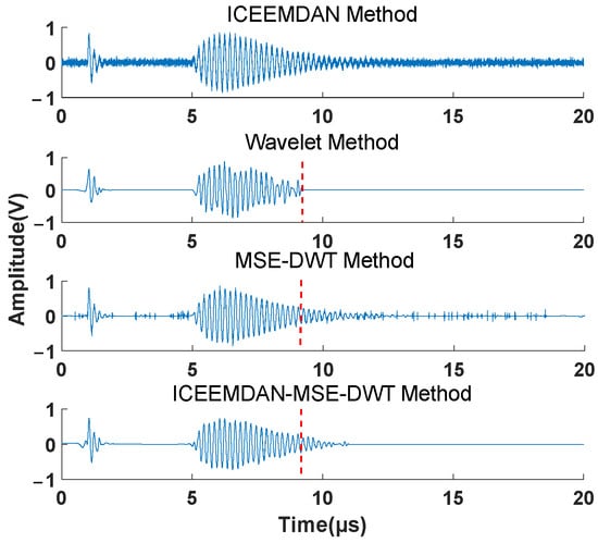 Figure 11 shows the results of the ICEEMDAN method, wavelet method, the MSE-DWT method described in Section 2.2, and the ICEEMDAN-MSE-DWT method described in Section 2.3. The results for the ICEEMDAN method show that it retains effective information but contains a significant amount of noise. The wavelet method achieves denoising but loses detailed information, and the MSE-DWT method preserves detailed information but still fails to fully separate detailed information from noise. These issues hinder the subsequent analysis of partial discharge signals. In comparison, the ICEEMDAN-MSE-DWT method successfully eliminates noise while preserving more detailed information, achieving better denoising results.