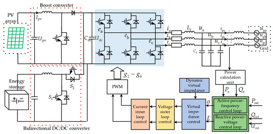 As the penetration of renewable energy in global power systems continues to increase, particularly with the large-scale integration of intermittent sources such as wind and photovoltaic (PV) power, the stability and reliability of power systems are facing significant challenges [1,2,3]. The intermittency and volatility of renewable energy sources require the grid to have higher flexibility and fast response capabilities to address the impact of generation fluctuations on frequency and voltage. Additionally, the increased coupling of the system means that local faults may trigger chain reactions throughout the grid. These factors pose growing challenges to the stability and reliability of modern power systems. Therefore, enhancing the grid’s flexibility and emergency response capabilities, along with adopting new control strategies, is key to addressing these issues. Currently, grid-following (GFL) control is commonly used in grid-connected photovoltaic systems. Researchers have focused on low-voltage ride-through (LVRT) control during grid faults. For instance, Reference [4] derived the voltage magnitude at the grid connection point under unbalanced faults based on the output characteristics of inverters during these faults and used inverter output current thresholds to determine the optimal reactive current at different voltage sag stages, achieving voltage support. Reference [5] adjusted PV output power based on the depth of the grid-side voltage sag to maintain a constant DC bus voltage, but the control structure employed GFL control without energy storage devices for power smoothing, leading to inadequate transient control performance. Reference [6] used a DC bus overvoltage ring control to maintain a constant DC bus voltage, but the DC bus voltage increases during LVRT. References [7,8] studied the regulation of adaptive energy management under abnormal photovoltaic operation conditions, utilizing energy storage systems and other methods. By considering the dynamic characteristics of the energy storage system, control algorithms were employed to effectively enhance the voltage sustainability of the DC microgrid, providing strong evidence for the feasibility of the energy storage system.