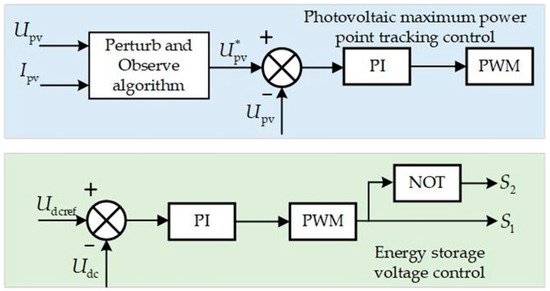 where and represent the active power output from the photovoltaic array, the active power output from the energy storage system, the active power loss, and the active power output from the inverter to the grid, respectively.