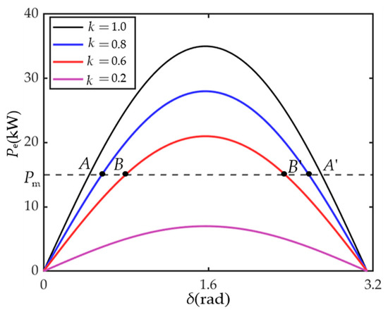 In Figure 3, for voltage sags of 20% and 40%, the power-angle curve of the VSG intersects with the mechanical power , while for a voltage sag of 80%, the power-angle curve no longer intersects with . If the system intersects at points A and B during the fault, it is considered to be at a stable equilibrium point (SEP); if the system intersects at points A’ and B’, it is considered to be at an unstable equilibrium point (UEP), which could lead to transient instability.