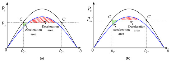 According to the equal-area criterion of power system transient stability [28], the condition for the system to maintain transient stability is that the maximum accelerating area should be less than the maximum decelerating area. From Figure 4, it can be seen that the standard power-angle curve is shown in black, and after a voltage drop occurs, it is shown in blue. As the active power command value increases, the accelerating area increases while the decelerating area decreases. Therefore, an increase in the active power command value will affect the transient stability characteristics of the VSG and may even lead to instability.