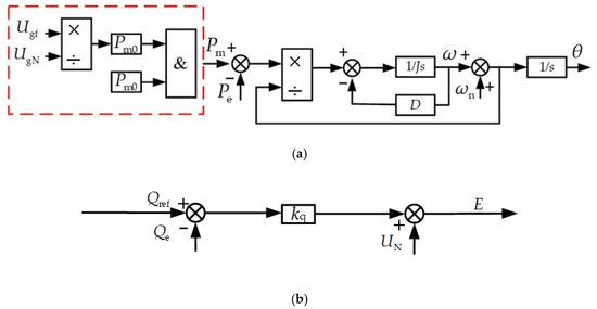 Thus, in this paper, based on the grid voltage sag degree and combined with Equations (2), (3) and (7), the active power loop adopts a VSG grid voltage response-based power dispatch strategy. According to the relevant provisions of reference [29], reactive power is increased by issuing additional reactive power. The power loop control block diagram is shown in Figure 5, where the reactive current injected by the inverter into the grid, and , must satisfy: