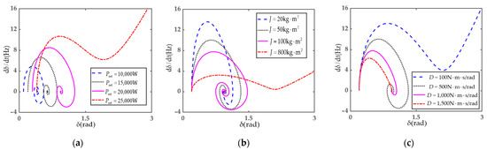 VSG phase plane diagram under different control parameters: (a) different active power command values; (b) different virtual inertia values; (c) different damping coefficients.