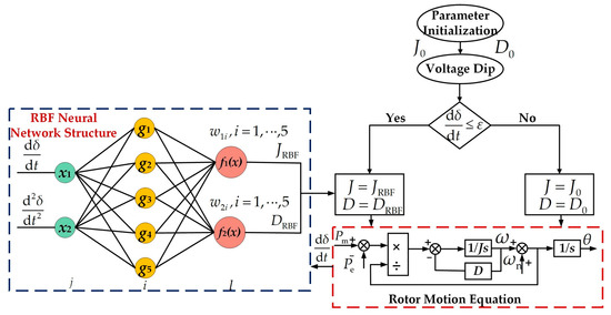In summary, to avoid insufficient accuracy of the RBF neural network and oscillations caused by poor dynamic performance during the early stages of training, this paper adopts a switching mechanism based on the rate of change in the power angle. Specifically, when a voltage sag is detected, the rate of change in the power angle is compared with a threshold value . Once the system enters a stable or semi-stable state, it switches to the RBF neural network for adaptive adjustment. The threshold value, virtual inertia, and damping coefficient should be selected according to the specific conditions of the power grid [32,33,34]. In this paper, the values are chosen as , , respectively. This approach not only maintains a fast response during the initial control phase but also improves the system’s stability and recovery performance in the later stages through adaptive adjustment by the neural network.