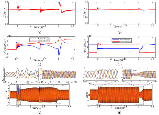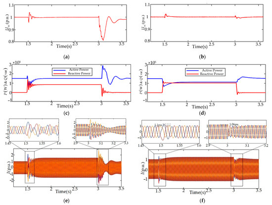 First of all, when the grid voltage drops to 0.5 pu, the system’s transient responses under different control strategies are shown in Figure 9. By comparing Figure 9a,c with Figure 9b,d, it can be observed that after adopting the improved control strategy, the fluctuations in VSG output power and DC bus voltage are reduced, and the system’s power dynamic response is accelerated, demonstrating better transient. As shown in Figure 9f, the inverter output current during the fault and recovery phases is limited to 1.1 times the rated current, ensuring the safe operation of the VSG.