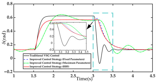 To verify the transient regulation characteristics of the proposed RBF neural network-based control strategy, a comparison was conducted among the traditional VSG control, fixed-parameter control, and the proposed control strategy, as shown in Figure 10. The incremental change in output power angle and the settling time are used as quantitative performance indicators for dynamic performance analysis. The analysis metrics for each algorithm are shown in Table 3. The traditional VSG control exhibited significant transient power-angle overshoot and oscillations after fault clearance, with a maximum power-angle peak of approximately 0.62 rad, and a slow recovery speed. The improved fixed-parameter control strategy partially suppressed the overshoot and reduced the oscillation amplitude, with a maximum power-angle peak of approximately 0.54 rad, but its dynamic adjustment capability remained limited, and the recovery speed was still inadequate. In the case of improved maximum parameters, the overshoot during the fault period is relatively large, and the settling time is very long. Even after fault clearing, it is difficult to restore stability. In contrast, the RBF neural network-based adaptive control strategy significantly improved the transient power-angle characteristics through dynamic regulation, with a maximum power-angle peak of approximately 0.52 rad. It responded rapidly within 0.1 s after the fault occurrence, with the smoothest power-angle variation, and the system quickly returned to a stable state within approximately 0.79 s after the fault. This not only effectively suppressed the overshoot and oscillations after fault clearance but also accelerated the recovery speed of the power angle, thereby significantly enhancing the transient regulation performance of the system.