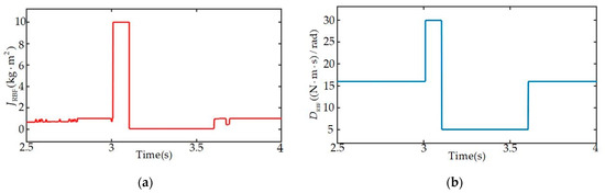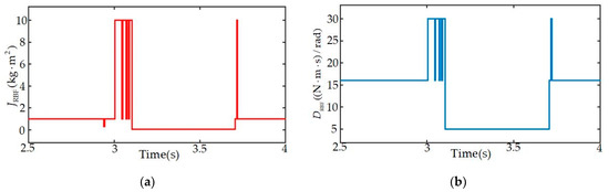 Dynamic values of and under severe voltage sag: (a) values of virtual inertia ; (b) values of the damping coefficient .