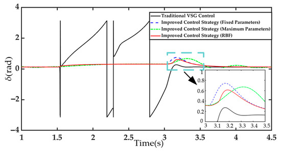 Figure 13 shows the transient power-angle characteristics under severe voltage sag for the traditional VSG control, fixed-parameter control, and the proposed control strategy. After the fault occurs, the power-angle peak of the traditional VSG control reaches approximately 3.4 rad, with large oscillation amplitudes and prolonged oscillation duration, indicating significant instability. The evaluation metrics under severe voltage sag conditions are shown in Table 4. The improved fixed-parameter control strategy effectively enhances system stability, but during the fault recovery period, the power-angle peak reaches approximately 0.78 rad, offering limited performance improvement. In the case of improved maximum parameters, the recovery speed of the angle of attack is slow, and it cannot return to its initial value within a short period of time. In contrast, the RBF-based improved control strategy not only ensures system stability but also reduces the power-angle peak to approximately 0.61 rad, while the recovery time remains 0.61 s.