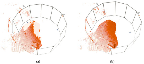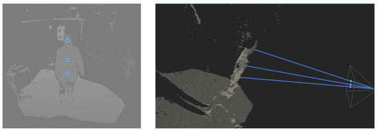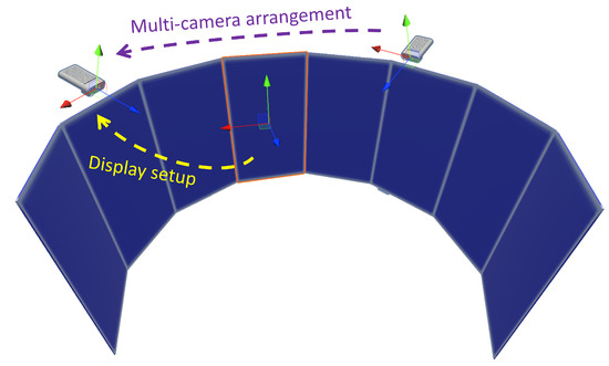 Fundamentally, what is required to perform such associations is a combination of size measurements and placement data (position and orientation) for both the RGB-D camera and each individual display in the same coordinate system. A practical way to accomplish this (at least in terms of processing at runtime for the tracking system) is to provide these measurements and placement data for each display in the coordinate system of the RGB-D camera. Since we had access to a blueprint of our own display arrangement, including screen measurements and precise positioning, it was straightforward to turn that blueprint into a 3D scene, whichcould have been carried out with any modelling software. Our goal was then to find a way to gather the exact placement of the RGB-D camera in relation to that scene. For this, our approach was to start from an approximate placement of the camera in the scene and adjust that placement manually. This was accomplished through a Unity (unity.com, accessed on 1 November 2024) application (which has also been open-sourced [51]) which virtually renders the display arrangement as well as the camera and computes a transformation matrix between the virtual camera’s coordinate system and Unity’s world coordinate system. The placement of the virtual camera may then be adjusted with the help of the depth data coming from the real camera, as each of its captures can be converted to a point cloud, as illustrated in Figure 3. The resulting point cloud can then be displayed in the Unity application at the appropriate position with regard to the virtual camera thanks to .