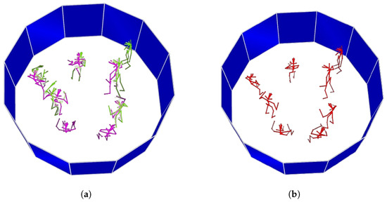 Once the data coming from each sensor have been converted to a common coordinate system (e.g., that of a “main” camera), it might seem straightforward to perform matchings by simply looking at the distance between certain stable and reliable joints or by comparing the centres of the bounding boxes around the tracked skeleton or even multiple body parts [23]. This is illustrated through a rather simple but crowded case in Figure 2, where input skeletons from two sensors are shown in Figure 2a and combined into a merged set presented in Figure 2b.
