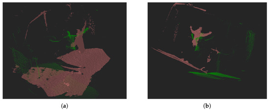 We then tried the chequerboard approach based on example code found in the Azure Kinect SDK repository (github.com/microsoft/Azure-Kinect-Sensor-SDK/tree/develop/examples/green_screen, accessed on 1 November 2024), which required some matrix permutations and conversions as the camera coordinate system which the example worked with was different from that used by \psi. Unfortunately, the results obtained after trying this approach were not satisfactory either (see Figure 5b), although we printed the pattern on an A3 piece of paper and set it on a solid cardboard plate instead of using a “commercial” chequerboard, which might have led to better results.
