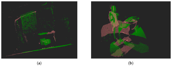 To accomplish this, we placed various objects such as cardboard boxes or chairs in line in an area which was seen by both cameras. We then asked the person (whose skeleton was used as a common reference to initiate the ICP process) to stand close to these objects and only considered point cloud points which were close to that person. This normally resulted in two point clouds which contained many common points for the floor below the reference person but also the previously mentioned jointly tracked (“front-facing”) surfaces, including the front-facing side of the person itself. Our hope with that approach was that the inclusion of floor points would produce an ICP result whose transformation matrix would lead to fused data where the floor points were aligned. The individual whose skeleton was utilised as a common reference to start the ICP process was then asked to stand close to these items, and only point cloud points which were near that person were taken into consideration. This would hopefully result in two point clouds including the previously described jointly tracked (“front-facing”) surfaces, among which were the person’s front-facing side as well as numerous common points for the floor beneath the reference person. The idea behind that strategy was that we expected the floor points to help the ICP runs with aligning the floor, and the points from other jointly tracked surfaces would themselves assist with the rest of the degrees of freedom. The combination of both types of points should therefore lead to good alignments. Following this procedure, we did in fact obtain results which were correctly aligned after a few ICP runs, as shown in Figure 6b.