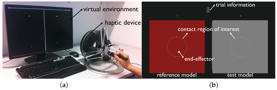 The experimental equipment consists of a monitor and a haptic device, as shown in Figure 1a. The monitor presents a virtual environment to the operator, who can interact with it by manipulating a haptic device. The virtual environment on the monitor displays not only the location of the device (similar to a mouse pointer), but also the objects with which the operator should interact. In this study, a custom virtual environment running on a custom-built PC (Intel Core i7 CPU, Intel Corporation, Santa Clara, CA, USA; 16 GB RAM, Samsung Electronics, Republic of Korea; NVIDIA GeForce RTX-2060 GPU, NVIDIA Corporation, Santa Clara, CA, USA) was used in this study. The Omega 3 device (Force Dimension, Nyon, Switzerland) was used, which offers 3-DOF translational motion with a refresh rate of up to 4 kHz, a maximum translational force of 12.0 N, a workspace of 160 × 110 mm, a resolution of less than 0.01 mm, and a closed-loop stiffness of 14.5 N/mm. The operator can manipulate the position of the haptic device by moving it accordingly. To ensure high-fidelity haptic feedback, a haptic update rate of 1 kHz was used, which is consistent with the standard update rate of typical haptic systems.