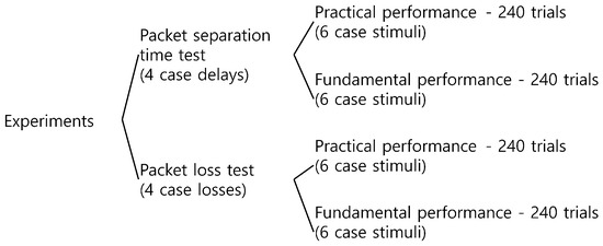 In this study, we conducted a total of 960 trials per participant, which is an expansion compared to the 240 trials reported by [5], as shown in Figure 2. First, the above-mentioned imperfect communication network was divided into a packet separation time test (time delay) and a packet loss test (data loss). Note that each experiment was performed for four time delays and four data losses. In addition, each case was divided into the practical performance test and the fundamental performance test. The test of practical performance was a test presented to the participants applying imperceptible communication (time delay and data loss) to both the haptic display of the reference model and the test model. On the other hand, the fundamental performance test was a test presented to participants with imperfect communication applied only to the haptic display of the test model, not the reference model. Note that the fundamental performance test could give more precise reference stimuli to the participants than the practical performance test because there was no effect of imperfect communication on the reference model. Thus, in this study, four experimental procedures were performed.