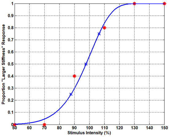 The method of stimuli analysis given in [30] is used as a psychophysical experiment method. Psychometric functions are then fitted by the Weibull logistic function to measure each participant’s discrimination sensitivity via the JND metric. They are derived using the Matlab psignifit toolbox, which implements the maximum likelihood method described in [31]. Discrimination sensitivity is measured as the difference in stiffness values between the 25th and 75th percentiles of the psychometric function. A lower value indicates greater sensitivity in discrimination—that is, better awareness of the environment. A psychometric function is shown in Figure 3 with a perfect communication network as a reference. Finally, PSE is used for haptic performance, which is calculated from the fitted psychometric function. Note that PSE gives the value of the relative stimulus intensity for which the test model is perceived to have intensity equal to that of the reference model.