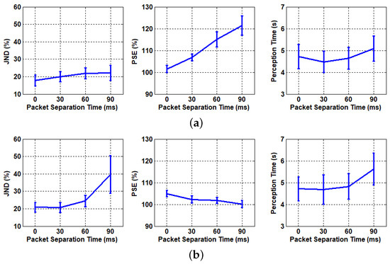 Figure 4 and Table 1 show the experimental results for the fundamental performance test and the practical performance test, respectively, with the packet separation time. JND, PSE, and are used to evaluate the ability of participants to perform the discrimination task as performance metrics. In the next subsection, these three performance metrics for two tests will be detailed and analyzed.