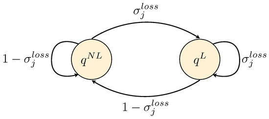 Note that (no-loss) and (loss) indicate whether each sampled packet is successfully transmitted or dropped. A transition to freezes the position of the wall at , potentially causing short force discontinuities. Here, we assume independent and uniformly distributed losses, which simplifies the analysis by avoiding more complex burst or Markov patterns.