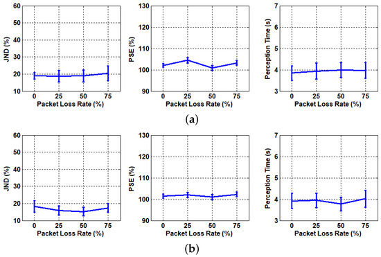 Figure 6b displays the results when both the reference and test walls were subjected to packet loss at the same rate. The ANOVA again showed no significant effect of on JND (), PSE (), or (, ). This result could also be explained based on the human perceptual bandwidth discussed in Section 4.2.1.
