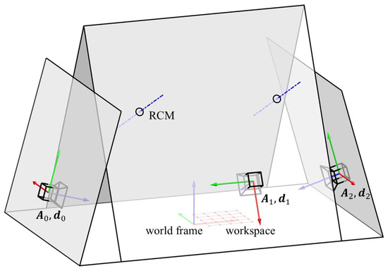 The system uses three cameras to distribute viewpoints as evenly as possible to maximize coverage of the enclosure’s interior. Camera positions are optimized based on their Field of View (FOV) and the condition number of the triangulation matrix, as discussed in a later section. To accurately determine an object’s spatial coordinates within the workspace, the object must be visible to at least two cameras. The accuracy and performance of this estimation method are validated in subsequent examples. The workspace within the enclosure refers to the region where the tips of the laparoscopic graspers are visible to at least two cameras, enabling effective position estimation. The functional workspace is slightly smaller than the total physical volume of the enclosure.