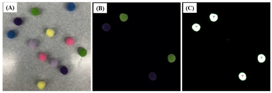 Color-based segmentation is applied to identify surgical instrument tips. (A) shows color markers, (B) highlights the segmented colors, and (C) shows centroids for triangulation.