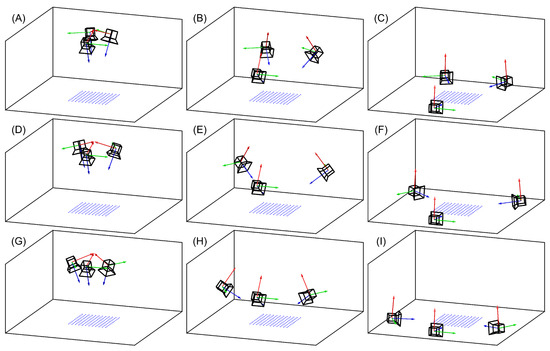 To evaluate the camera layouts, tests were conducted with various configurations, all maintaining the same distance to a single target position, as illustrated in Figure 6. In other words, the cameras in the simulated scenarios, Figure 6A–I, are positioned on a common spherical surface. The nine camera layouts form a matrix of scenarios. In each column of the matrix, all cameras are placed at the same height relative to the target position, corresponding to the same polar angle, , relative to the sphere’s central axis. In each row, the layouts share the same azimuthal angle distribution, , on the sphere. For consistency, one camera is always located on the symmetry plane, while the other two are symmetrically distributed on either side. The azimuthal distribution angle, , defines the angle between the first camera and the other two cameras.