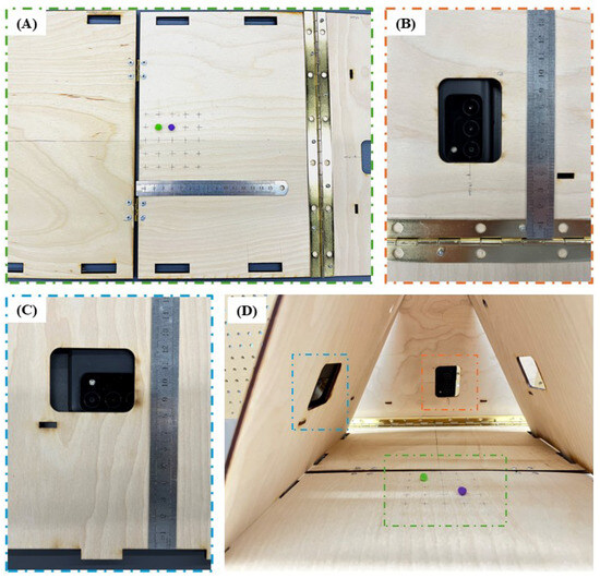 - The smartphones are fixed at the designed positions of the proposed portable system (Figure 2). The cameras are located at the centers of the windows located on the box designed for the cameras. Smartphones do not change positions during usage.