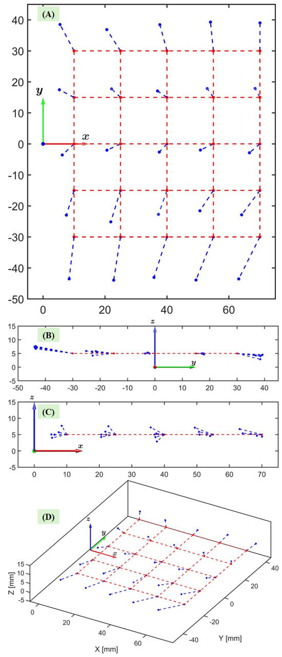 Accuracy test results comparing estimated target positions (blue points) to ground truth target positions (red grid) across different planes: (A) -plane, (B) -plane, (C) -plane, and (D) 3D view of the workspace. All dimensions are presented in millimeters. The red, green, and blue arrows represent the x-, y-, and z-axes, respectively.