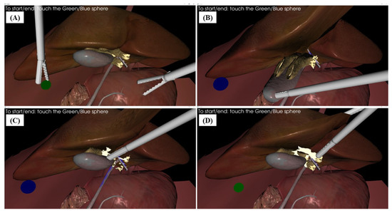 Figure 10A–D present the simulation results of the VR environment for laparoscopic training, showcasing realistic visualizations of the gallbladder and surrounding organs. The system effectively replicates key procedural steps, including dissecting connective tissue to expose anatomical structures and isolating the gallbladder for removal. The simulation integrates precise hand motion capture, enhancing the realism and educational value of the training experience. The figure illustrates the system setup with two laparoscopic grippers, demonstrating their ability to interact with virtual organs. Specific interactions include grasping the liver or gallbladder and performing tissue dissection, highlighting the system’s functionality and relevance to surgical practice.