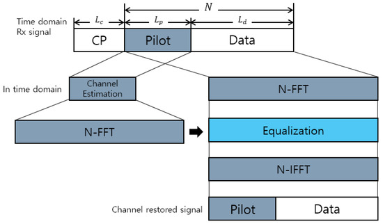 Figure 1 illustrates the typical SC-FDE transmission structure and the receiver equalization process. An SC-FDE block consists of a cyclic prefix (CP), pilot, and data. Unlike OFDM, which uses an Inverse Fast Fourier Transform (IFFT) at the transmitter, SC-FDE follows a single-carrier transmission structure and does not require an IFFT at the transmitter. However, a CP is appended to enable frequency domain equalization at the receiver. The length of the CP is , which corresponds to the last symbols of the data. The lengths of the pilot and data are and , respectively. The total length of the pilot and data is , which is also the size of the FFT at the receiver used for equalization. At the receiver, channel impulse response (CIR) estimation is first performed for equalization. The CIR is estimated using the pilot. Let the received signal after passing through the wireless channel be denoted as , the channel impulse response as , and the transmitted pilot signal as . Then, the received signal can be expressed as