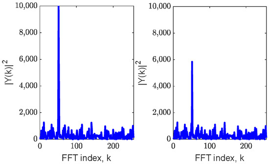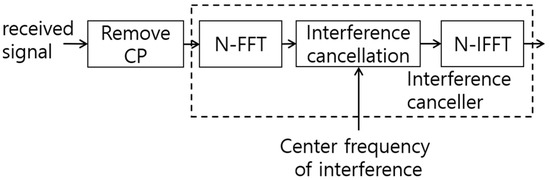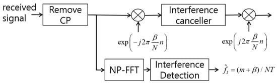 Figure 2 illustrates the interference cancellation method used in this paper. To cancel out the interference, the CP is first removed, and N-point FFT is performed. This process corresponds to (4). If the interference frequency is known, interference cancellation can be simply performed by nulling the corresponding frequency. For example, if the frequency is , the interference cancellation can be simply performed by nulling the corresponding FFT grid. In other words, the corresponding spectrum is set to ‘0’ or . However, the interference frequency is unlikely to exactly match one of the FFT grid points If the NBI frequency does not align with one of these grid points, the best approach is to select the grid closest to the interference frequency and perform nulling [22]. In this case, however, the NBI will not be completely removed.