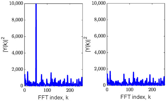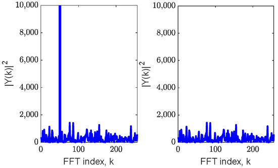 Let us consider an example for this issue. Assume . Figure 3 shows before and after interference cancellation when . The SIR is 10 dB. Interference cancellation is simply performed by nulling, setting . When the interference frequency perfectly aligns with the grid frequency, it is confirmed that the interference is completely removed.