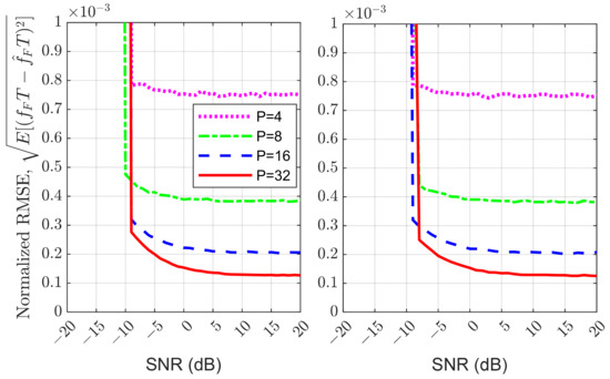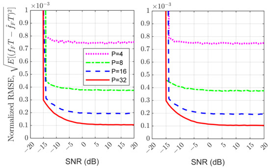 In Figure 8 and Figure 9, the left and right subplots represent RMSEs for AWGN and ETU channels, respectively. As the SIR increases, the interference power decreases, which improves the estimation accuracy for SIR = 0 dB compared to SIR = 5 dB, particularly in the low-SNR region. The results also demonstrate that RMSE decreases as the frequency oversampling factor P increases. For P = 16, the RMSE reaches its minimum around SNR = −5 dB and remains almost the same at higher SNRs. Interestingly, the RMSE performance shows negligible differences between the AWGN and ETU channels. This result shows that the proposed NBI cancellation technique is robust to different channel models.