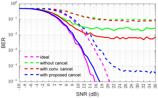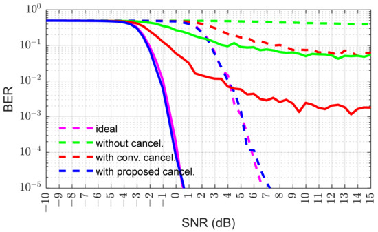 In practical scenarios, interference is typically perceived as degraded channel quality. Under such conditions, the system would likely adopt the lowest modulation order, such as QPSK, to ensure reliable communication. However, when the interference is strong, even QPSK may fail to restore the received signal accurately. In such cases, the proposed NBI cancellation technique can effectively improve performance. For higher-order modulation schemes, the proposed NBI cancellation technique is also expected to improve BER performance in the presence of NBI. However, higher modulation orders generally require a high SNR to achieve the desired BER performance, even in the absence of NBI. In such cases, residual NBI after cancellation may severely degrade BER performance. For these reasons, the computer simulation in this paper focuses exclusively on QPSK.