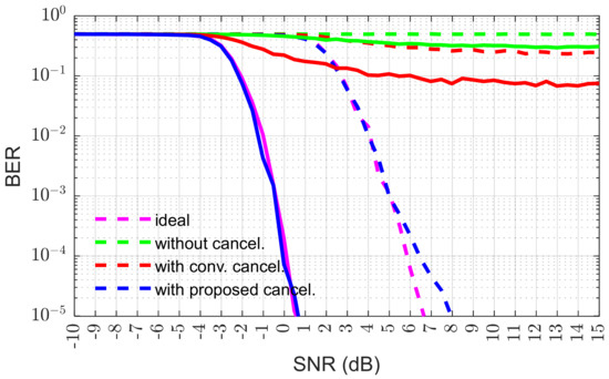 The performance is measured by comparing the BER after interference cancellation. Specifically, three BER curves are compared: the ideal BER performance without interference, the conventional interference cancellation technique [22], and the proposed interference cancellation technique. Figure 10 and Figure 11 show the BERs in the AWGN channel for SIR = 5 dB and 0 dB, respectively. The dotted lines represent the results with a repetition of 1, while the solid lines show the results with a repetition of 4. For comparison with ideal performance, the BER performance without interference is also shown. In the ideal BER curve, a repetition of 4 improves the BER performance by approximately 6 dB. In Figure 10, when interference is present and no cancellation is applied, the worst performance is observed. When the conventional interference cancellation method is applied, some improvement in performance is noted, but significant performance degradation is still observed compared to the ideal BER. In contrast, when the proposed fine frequency shift interference cancellation is applied, BER performance shows negligible loss compared to the ideal BER, regardless of the repetition count. Figure 11 shows the performance when SIR = 0 dB. The interference is stronger than Figure 10. In this case, both curves without interference cancellation and with the conventional cancellation method show degraded performance compared to Figure 10. The conventional method degrades as the NBI power increases. This indicates that the conventional method fails to fully remove the NBI or that it introduces notable damage to the desired signal. However, when the proposed technique is applied, the BER performance approaches the ideal BER. With a repetition count of 1, there is a slight loss of approximately 1.5 dB at BER = 1 × 10−5, but when using a repetition of 4, the loss becomes negligible.
