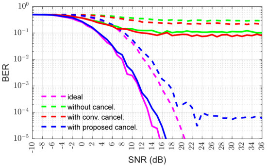Figure 12 and Figure 13 show the BER performance in an ETU fading channel environment with SIR = 5 dB and 0 dB, respectively. The dotted lines represent the results with a repetition of 1, while the solid lines represent the results with a repetition of 4. As in the AWGN channel, a repetition of 4 shows a 6 dB improvement in the ideal BER curve. The overall BER performance degrades in the ETU channel compared with the AWGN channel. In Figure 12, when interference exists and no cancellation is applied, the worst performance is observed. When the conventional interference cancellation method is applied, only minor improvements are observed. However, with the proposed cancellation method, a notable performance improvement is seen. If the repetition is 1, a substantial performance loss is observed compared to the ideal BER, and a BER floor occurs, preventing the BER from dropping below 5 × 10−5. In contrast, increasing the repetition to 4 reduces the performance loss to only about 2 dB compared to the ideal BER, and the BER floor disappears. The results in Figure 13 for SIR = 0 dB show similar characteristics to those in Figure 12. When the conventional interference cancellation method is applied, the performance severely degrades, but with the proposed technique, the performance does not significantly worsen compared to Figure 12. While a BER floor appears with a repetition of 1, increasing the repetition count to 4 reduces the performance loss to within approximately 2 dB, and no BER floor is observed.