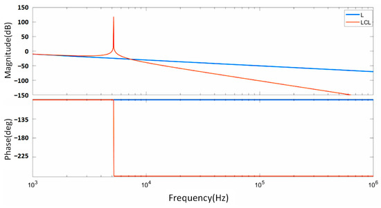 Figure 2 shows the Bode plot of the L-filter with different inductor values. As seen from the figure, the L-filter has limited capability to attenuate low- and mid-frequency harmonics. Additionally, the larger the inductor value, the greater the harmonic attenuation across the entire frequency range. Therefore, if a higher level of harmonic attenuation on the grid side is required, a sufficiently large inductor must be used. However, increasing the inductance inevitably results in an increase in the overall size and cost of the photovoltaic inverter, while also causing a greater voltage drop across the L-filter, which complicates the control of the DC bus voltage [24]. As a result, the L-filter is suitable only for applications where the cost and size requirements for the inverter are not stringent.