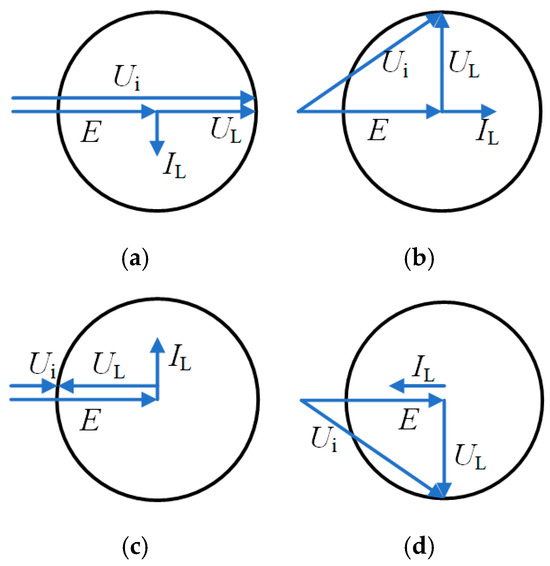 In the figure, Ui represents the inverter-side voltage vector, IL represents the inductor current vector, UL represents the inductor voltage vector, and E represents the grid-side voltage vector. It can be observed that, with E remaining constant, different inverter output voltages and inductance parameters correspond to different inverter states. When the grid-connected photovoltaic inverter operates in a pure inductive mode (as shown in Figure 6a), the design upper limit of the total inductance is the most stringent. In contrast, when the inverter operates in a pure capacitive mode (as shown in Figure 6b), the design upper limit for the total inductance is the most relaxed. Considering the most stringent case, if SVPWM control is applied, the total inductance (L + Lg) must satisfy the following: