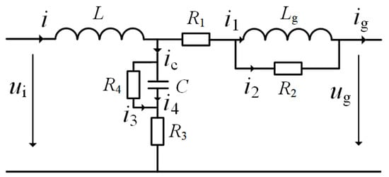 As shown in Figure 4, the LCL filter for the three-phase grid-connected inverter consists of an inverter-side filter inductor, a grid-side filter inductor, and a capacitor. Both inductors are connected in a series between the inverter bridge and the grid, while the capacitor is connected in parallel between the inductors of different phases. For ease of analysis and calculation, the system can be simplified into the single-phase equivalent structure shown in Figure 4.