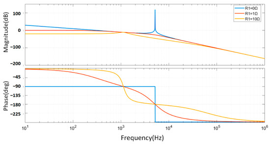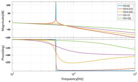 When using the grid-side inductance series resistor scheme, where R1 ≠ 0, R2 = ∞, R3 = 0, and R4 = ∞, the transfer function of the LCL filter is as shown in the figure below (Figure 8).