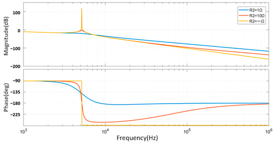 As shown in Figure 9, the grid-side inductance parallel resistor weakens the high-frequency attenuation capability of the LCL filter. In the legend, R2 = ∞ represents the undamped LCL configuration. Regarding resonance characteristics, without the damping resistor, the transfer function exhibits a pronounced resonance peak; as the impedance of the damping branch decreases, the degree of resonance attenuation increases.