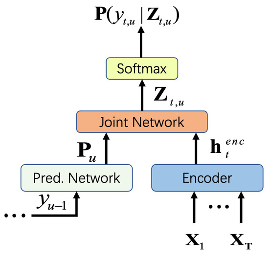 The RNN-T model is essentially an extension and improvement of the CTC model [30], directly performing joint modeling between the acoustic features and the output label sequence, thereby significantly simplifying the system architecture. As shown in Figure 2, the RNN-T model mainly comprises three core components: the encoder, the prediction network, and the joint network.